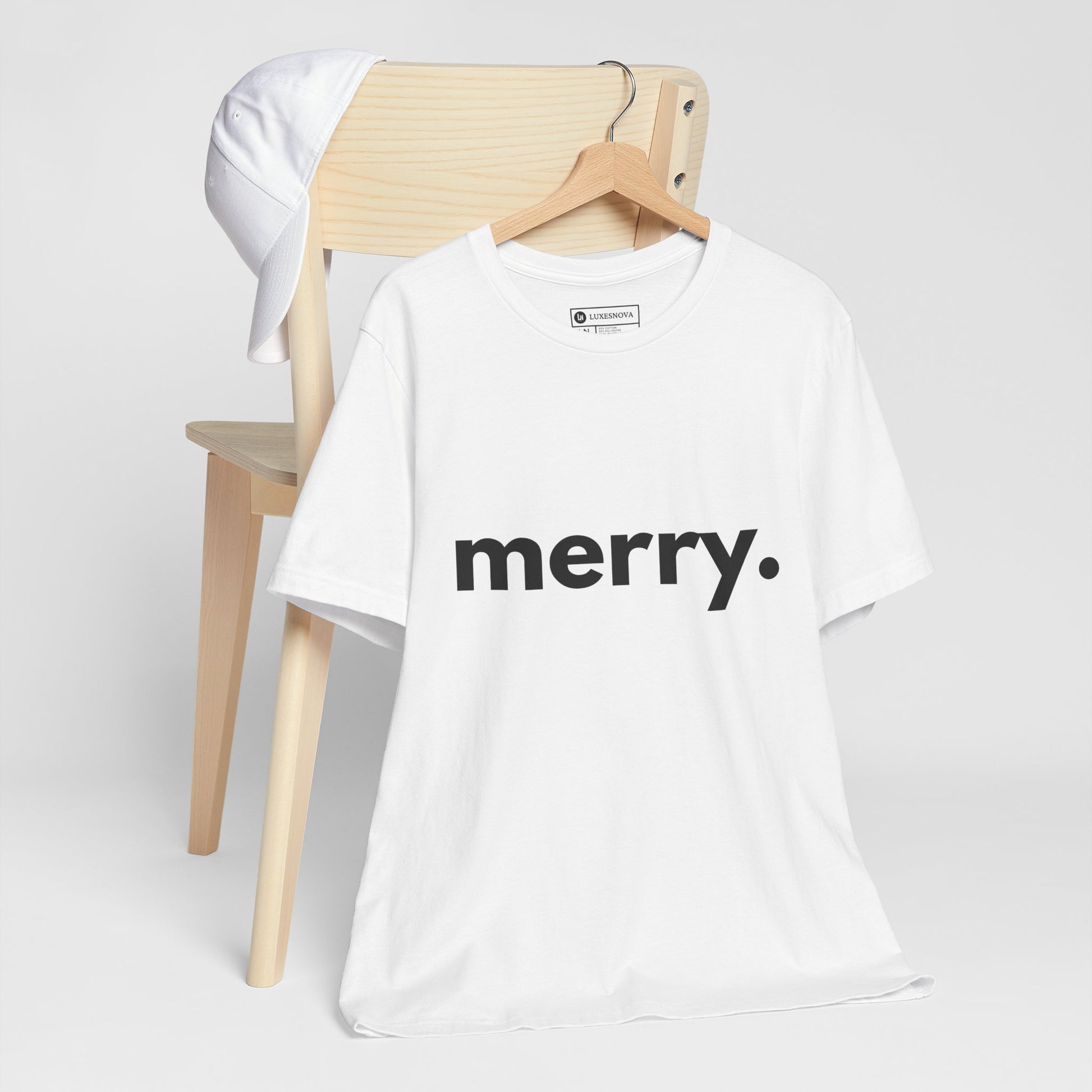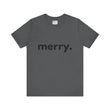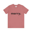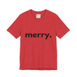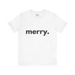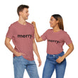 Embrace the spirit of joy and celebration with this stylish Unisex Jersey Short Sleeve Tee. Its minimalist design featuring the simple yet impactful word “merry.” brings a cheerful and cozy vibe to your holiday wardrobe. Whether you’re hosting festive gatherings, attending Christmas parties, or enjoying a cozy day at home, this tee adds a light-hearted touch of elegance to any outfit.